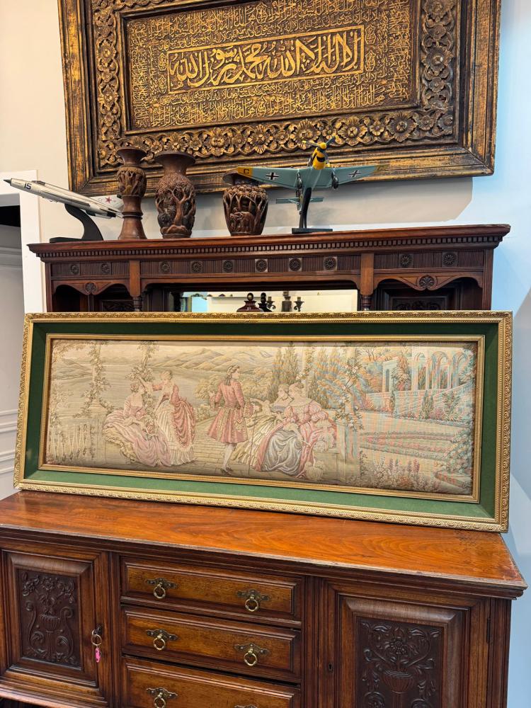 تحفة فنية نادرة من الطراز الفكتوري، مصنوعة من النسيج القماشي الفاخر، تجسّد مشهدًا أرستقراطيًا لنساء ورجال من النبلاء في جلسة حدائق ملكية حالمة. تتميز بتفاصيل دقيقة وألوان ناعمة تدل على الجودة والذوق الرفيع في الصناعة الأوروبية القديمة.